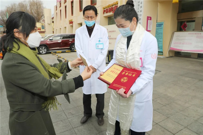 由于目前處于新冠肺炎疫情期間,兩位領(lǐng)導親自將此次榮譽送到阜康,雖然表彰儀式簡單,但卻意義非凡。西藏自治區(qū)人力資源和社會保障廳巡視員劉莉為李君院長獻上了潔白的哈達和"西藏自治區(qū)三八紅旗手”榮譽證書及獎牌,并勉勵道: