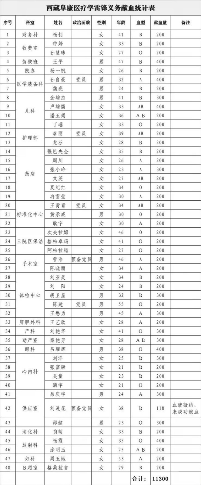 本次學(xué)雷鋒無(wú)償獻(xiàn)血活動(dòng)共有100多名員工報(bào)名,經(jīng)過(guò)認(rèn)真檢查篩選最終47人獻(xiàn)血成功(因血液凝結(jié),未能成功獻(xiàn)血1人),共計(jì)采血11300毫升,本次無(wú)償獻(xiàn)血活動(dòng)一定程度緩解了全市用血緊張局面,為臨床患者的救治工作提供了用血保障。